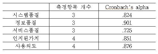 각 변수의 내적 일관성을 검증하기 위해 신뢰도 분석을 실시하였다. 신뢰도는 동일한 개념을 유사한 척도로 측정할 경우 일관된 결과를 산출하는 정도이며 척도의 신뢰도를 평가하는 지표로 가장 많이 사용하는 것이 크론 바흐알파 계수(Cronbach`s coefficient α)이다. 크론 바흐알파 계수는 0.6이상이면 수용할 만한 수준으로 받아들인다. 분석결과 0.725~0.901로 나타나 신뢰도가 매우 높다고 볼 수 있다.