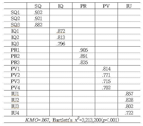 표 데이터의 각 측정 변수명은 편의상 시스템 품질(SQ), 정보품질(IQ), 서비스품질(PR), 인지된가치(PV), 사용의도(IU)로 기재하기로 한다. 본 연구의 요인 적재 값을 파악하고자 탐색적 요인분석을 실시하였다. 요인 추출 방법으로 주성분 요인분석을 실시하였고, 베리맥스 회전을 이용하였다. KMO 값은 0.6 이상일 때, 요인적재값은 0.4 이상을 기준으로 확인하였다. KMO 값은 .867로 나타났고, Barrlett의 구형성 결과도 .001로 나타나 요인분석 모형이 적합한 것으로 판단되었다.