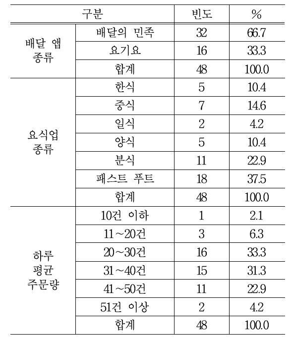 표본의 특성을 살펴보면 사용배달 앱은 ‘배달의 민족’ 66.7%, ‘요기요’ 33.3%로 나타났고, 종사하는 요식업 종류는 한식10.4%, 중식 14.6%, 일식 4.2%, 양식 10.4%, 분식22.9%, 패스트푸드 37.5%로 나타났다. 배달앱을 통한 하루 평균 주문건수는 21∼30건이 33.3%, 31∼40건 31.3%, 41~50건이 22.9%로 나타났다.