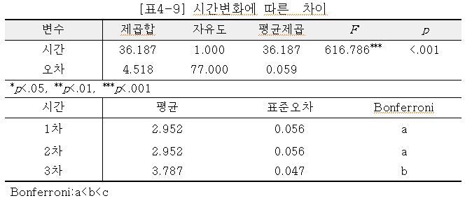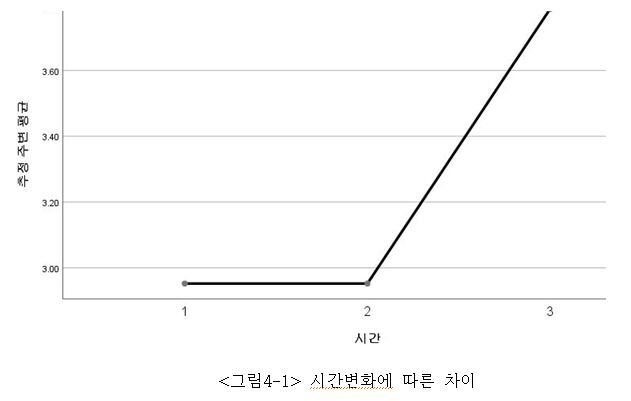 시간 변화에 따른 영향을 살펴보기 위해서 SPSS 프로그램을 이용해 반복측정 분산분석을 실시하였고, 표는 [표4-9]와 같이 작성한다. 그래프는 [그림4-1]과 같이 표현한다.