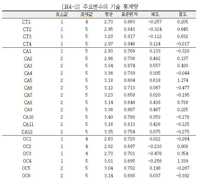 연구의 주요 변수의 정규성 검정을 위해 SPSS 프로그램을 이용해 기술통계분석을 실시하고, 평균, 표준편차, 왜도, 첨도를 살펴보고 설명한다.