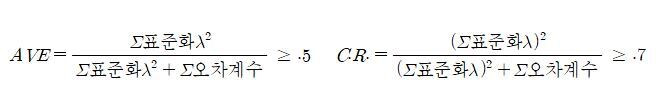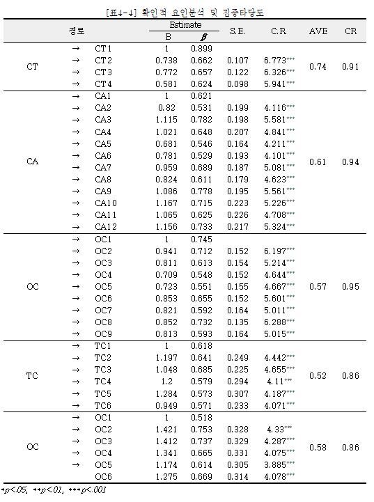 이론적 근거에 의하여 측정구조모형이 가설적으로 구축된 것을 확인하기 위하여 AMOS 프로그램을 이용해 확인적 요인분석을 실시하고, 집중타당성을 확인한다.