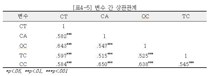 연구의 사전 조사의 자료로 각 변수 간의 상관성을 확인하기 위해 SPSS 프로그램에서 상관관계 분석을 실시하고, 상관관계 및 판별타당성을 검증한다.