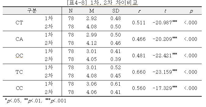 연구의 1차와 2차를 비교하기 위해서, SPSS 프로그램으로 대응표본t-검정을 실시하였다. 표는 [표4-8]과 같이 작성하면 된다.