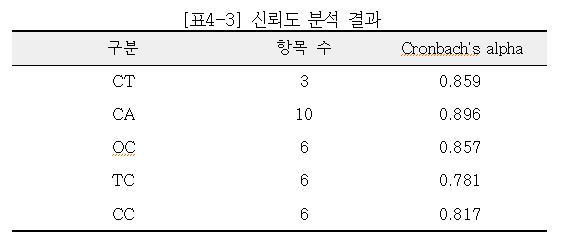연구의 요인 내 항목들의 일관성을 확인하고 위해, SPSS 프로그램을 이용해 신뢰도 분석을 실시하고, Cronbach's a값을 표기해 준다.