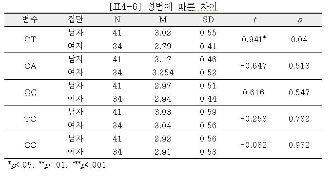 주요 변수의 유의한 차이를 알아보기 위해 표본의 인구통계학 변수들과 변인들에 대한 차이를 분석하기 위해서, SPSS 프로그램을 이용해 독립표본t-검정 및 일원 배치 분산분석을 하며, 표는 [표4-6]과 [표4-7]처럼 작성한다.